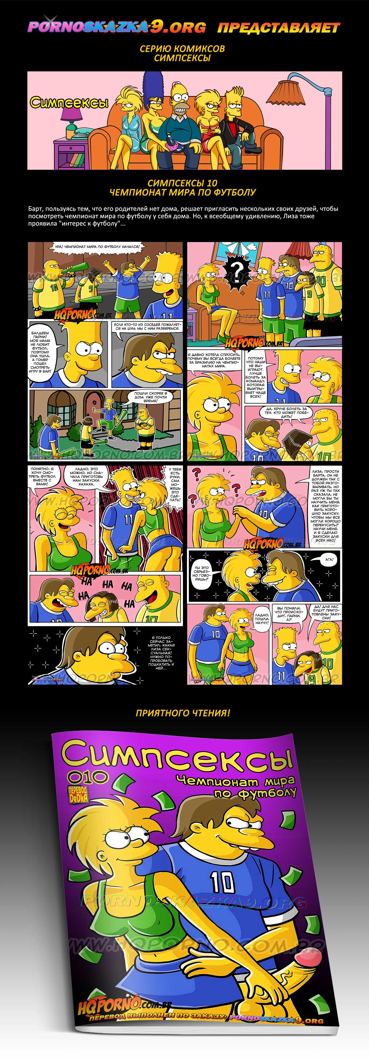 Порно комикс Симпсексы. Часть 10. Чемпионат мира по футболу. Барт, пользуясь тем, что его родителей нет дома, решает пригласить нескольких своих друзей, чтобы посмотреть чемпионат мира по футболу у себя дома. Но, к всеобщему удивлению, Лиза тоже проявила «интерес к футболу»…
